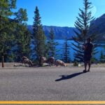 On hiking day I took off at nine-ish and walked up the road from the campground to Lake Minnewanka. It was one of the better road walks, with not too much traffic, attractive views, mountains all around, a single-lane bridge, and people stopping in the middle of the street to take a picture of the grazing herd of bighorn sheep (who were, in fairness, very neat). It was a good start, less than three miles, then I got to the Minnewanka frontcountry area and immediately turned into the protagonist from a Neil Breen movie.