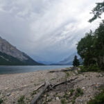 Though it’s not far from the trailhead, I picked Lm8 as a hedge against travel complications and because I thought I might make the five-mile-round-trip uphill trek to Alymer Lookout, or even the pass itself, to get some good solid mountain views. Those who did make that trip told me it was worth it, but I didn’t go; I am much more of a camp junkie than a trail junkie and got all the scenery I wanted from low elevation. As soon as I had my tent up I knew I’d be very happy right where I was. It was hot and it was pretty, so job done. Though the camp is both large and popular, thanks to all that beach there was plenty of room for private enjoyment, and in a pinch one could probably camp out there in reasonable comfort. It was also, for a while, quiet. Everyone else must have gone for the lookout, because just after five PM there were eight tents in camp and one person (me). I went for a stroll and surveyed all the emptiness: the very fine eating area, with benches and picnic tables and firepit, the great expanse of the beach, the camping areas, which offer limited but enjoyable views through the trees. It was a nylon ghost town. Only the boats going to and fro across the lake beneath thickening cloud suggested there hadn’t been a drop-everything-and-run emergency nobody had told me about. Remembering the West Coast Trail, I briefly wondered if Lake Minnewanka was prone to tsunami.